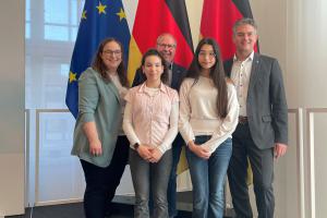Am vergangenen Freitag, dem 27.02.2026, nahmen Erva Bayram und Noelle Trostel den Preis stellvertretend für die AG entgegen. Ministerpräsident Alexander Schweitzer, Schirmherr des Wettbewerbs, händigte die Urkunde in der Staatskanzlei Mainz aus. Die Jury hob besonders hervor, dass das Projekt einen wichtigen Beitrag zu einem respektvollen und offenen Schulklima leistet und jungen Menschen eine Stimme gibt. Zur Preisverleihung reisten auch Heiko Sippel (Landrat des Landkreises Alzey-Worms) und Steffen Jung (Bürgermeister der Stadt Alzey) an, um der Toleranz-AG zum Gewinn zu gratulieren.