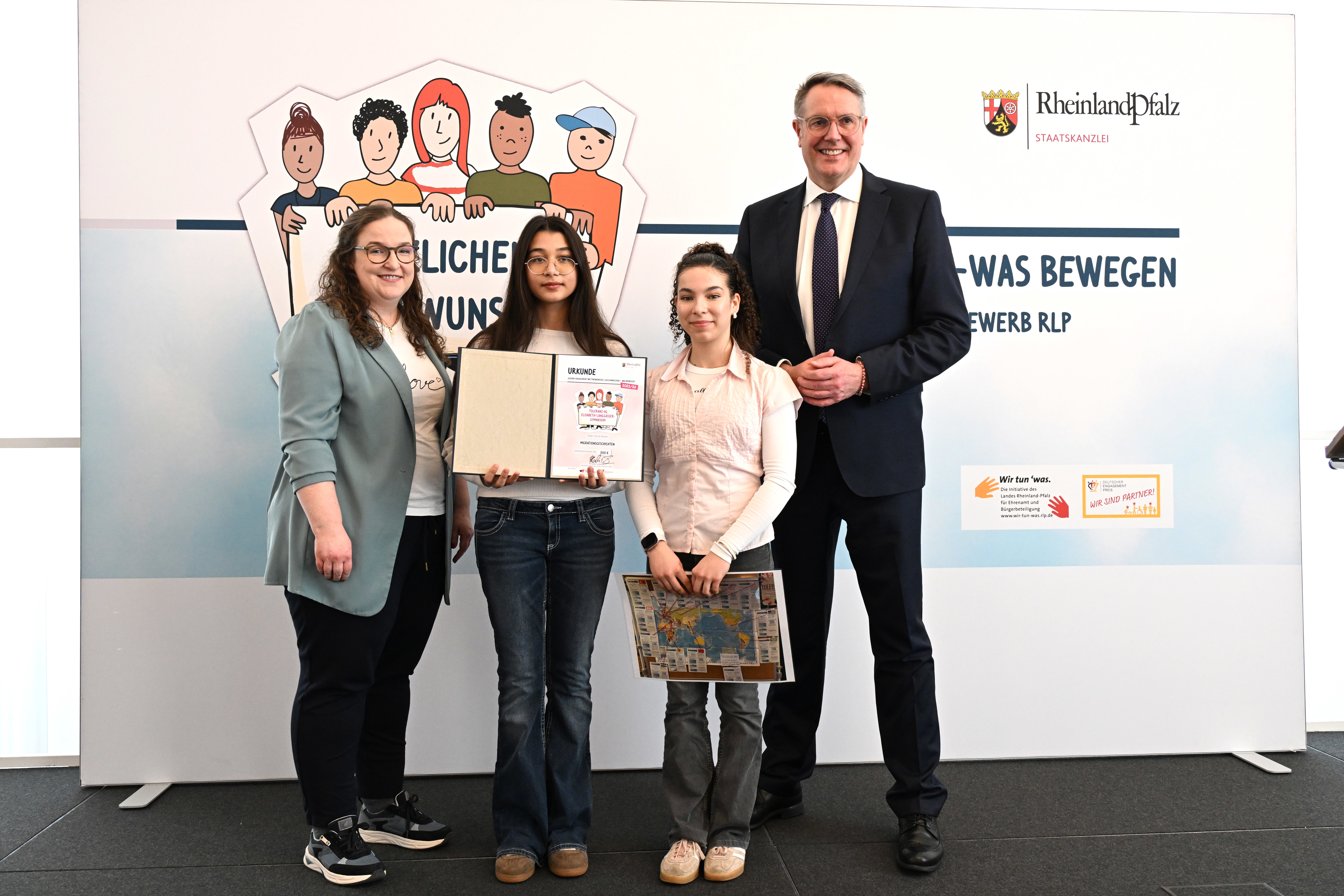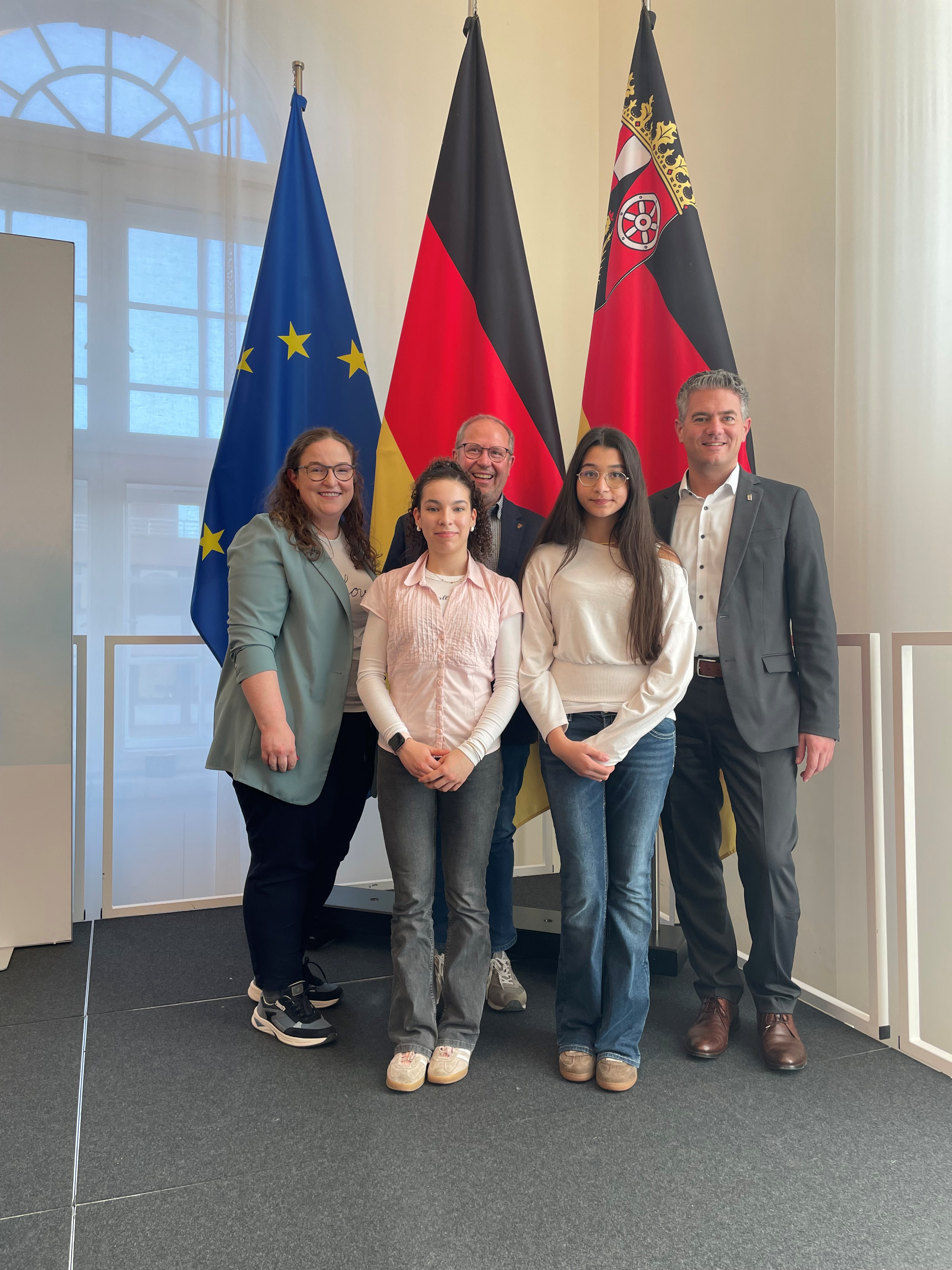 Am vergangenen Freitag, dem 27.02.2026, nahmen Erva Bayram und Noelle Trostel den Preis stellvertretend für die AG entgegen. Ministerpräsident Alexander Schweitzer, Schirmherr des Wettbewerbs, händigte die Urkunde in der Staatskanzlei Mainz aus. Die Jury hob besonders hervor, dass das Projekt einen wichtigen Beitrag zu einem respektvollen und offenen Schulklima leistet und jungen Menschen eine Stimme gibt. Zur Preisverleihung reisten auch Heiko Sippel (Landrat des Landkreises Alzey-Worms) und Steffen Jung (Bürgermeister der Stadt Alzey) an, um der Toleranz-AG zum Gewinn zu gratulieren.